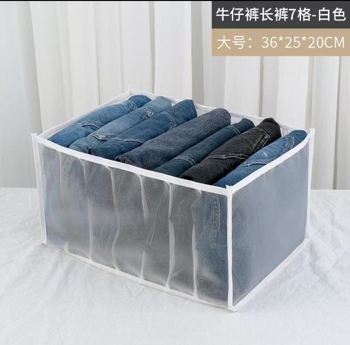 Jeans storage organiser The 7 grids clothes organizer drawers with transparent compartment is convenient for you to take clothes, saving time and space, which greatly improves the utilization rate of the wardrobe space, saving time and space.